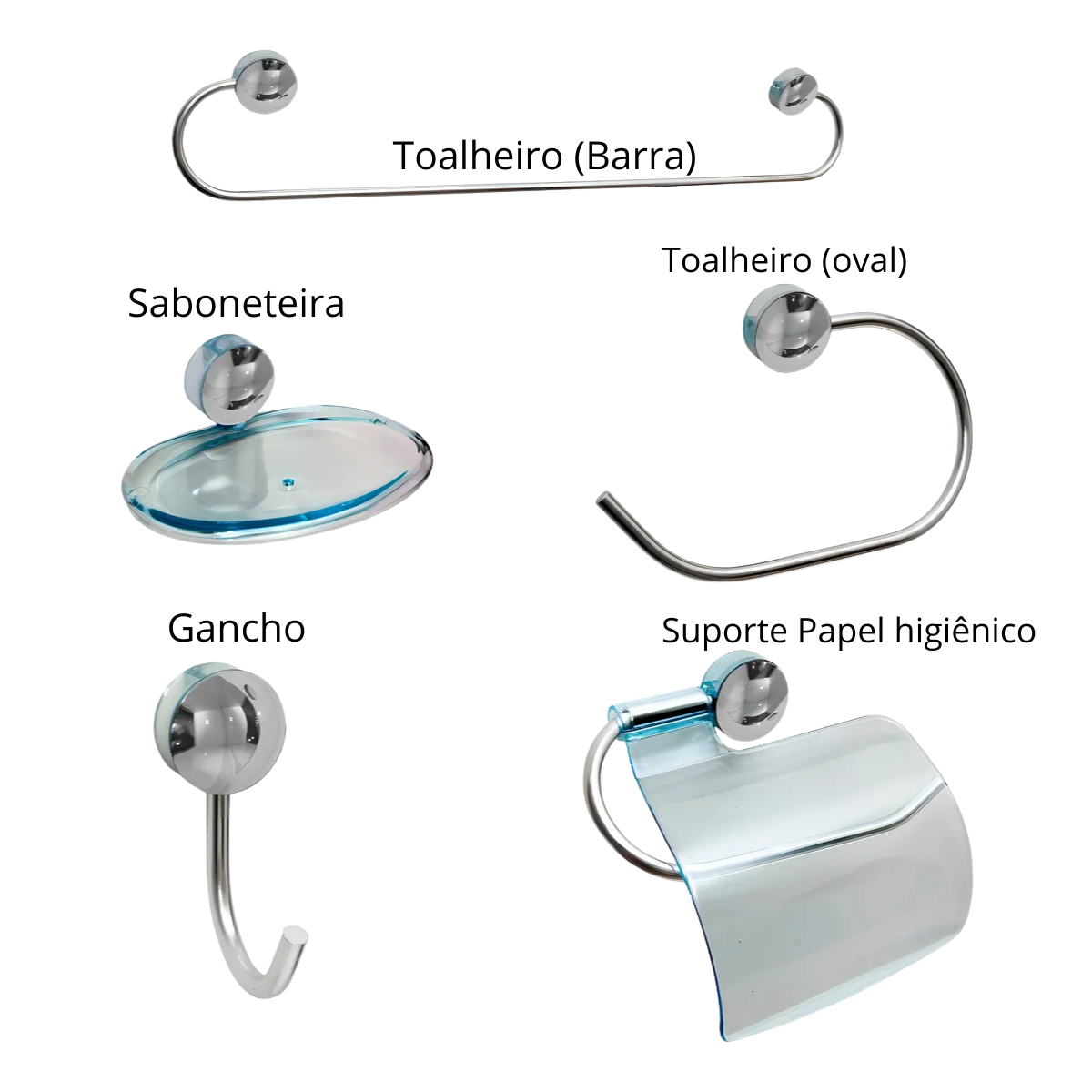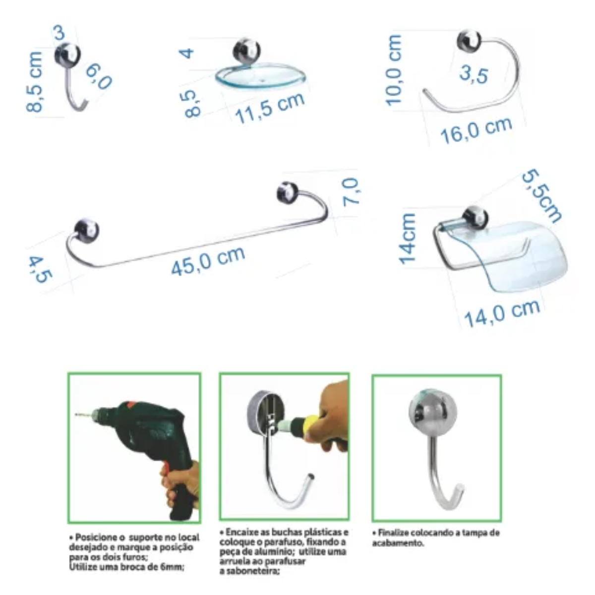 As tampas de acabamento são fabricadas em ABS cromado e a concha da saboneteira, tampa da papeleira e os suportes anti-giro em poliestireno.